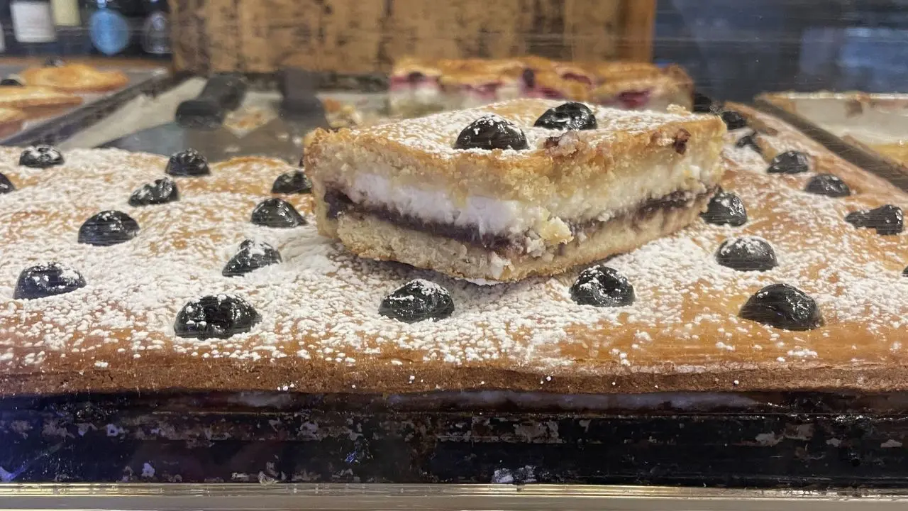 A traditional bakery tasting with a porchetta sandwich, sour cherry tart, and a glass of wine or water